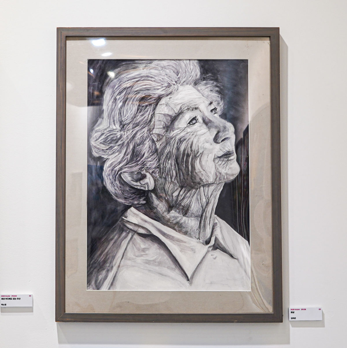 이 작품은 ‘보이지 않는 곳에서 전해진 마음’을 주제로 그린 그림입나다. 그림속 인물은 나이가 많은 할머니로 그녀의 주름 하나하나에 삶의 흔적과 깊은 감정이 담겨 있습니다. 저는 이 인물을 통해 우리가 평소에 느끼지 못하지만, 분명히 존재하는 누군가의 따뜻한 마음을 표현하고 싶었습니다. 이 분은 마치 하늘을 올려다보며 누군가를 떠올리는 듯한 표정을 짓고 있는데, 그 시선 끝에는 가장 행복했던 시절에 자신이나 사랑하는 가족이나 오래전의 추억이 있지 않을까 상상하며 작업했습니다. 직접적으로 드러나진 않지만, 인물의 눈빛과 얼굴에 스며든 감정들이 보는 사람에게도 조용히 다가가길 바랐습니다. 저는 이 그림을 통해 마음은 눈에 보이지 않아도, 충분히 전달될 수 있다는 걸 표현하고 싶었습니다.