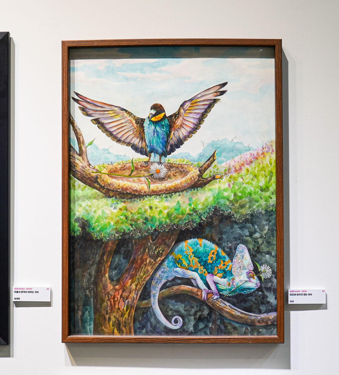 한 그루의 나무 위에 앉은 까치는 그 마음의 상징이에요. 한국에서는 복을 전하는 새이지만, 유럽에서는 불운이나 도둑의 상징으로 여겨지기도 해요. 하나의 존재가 서로 다른 의미를 가질 수 있다는 사실이 저에겐 다름의 아름다움처럼 느껴졌어요. 그 옆에 가득 열린 포도송이는, 작은 알갱이들이 모여 하나를 이루듯, 사람의 마음도 다양하게 모이면 풍요로워질 수 있다는 뜻을 담고 있어요. 그 사이엔 벚꽃이 피어 있어요. 짧고 화려하게 피었다 지는 벚꽃은 현대적 감성을 담고 있지만, 한국의 전통적인 자연과도 자연스럽게 어우러져요. 시대와 감성, 문화가 서로 다르더라도 함께 어울릴 수 있다는 걸 보여주고 싶었어요. 이 그림은 결국, 겉으로는 보이지 않아도 분명히 존재하는 마음들, 다름 속에서도 이어지는 조화와 연결을 이야기해요. 침묵 속에서도 마음은 흐르고, 그 마음은 색이 되고, 상징이 되고, 또 하나의 풍경이 되어 우리에게 다가와요. 이 모든 요소들이 모여, 보이지 않는 마음이 어떻게 조용히 전해질 수 있는지를 보여주고 싶었어요.