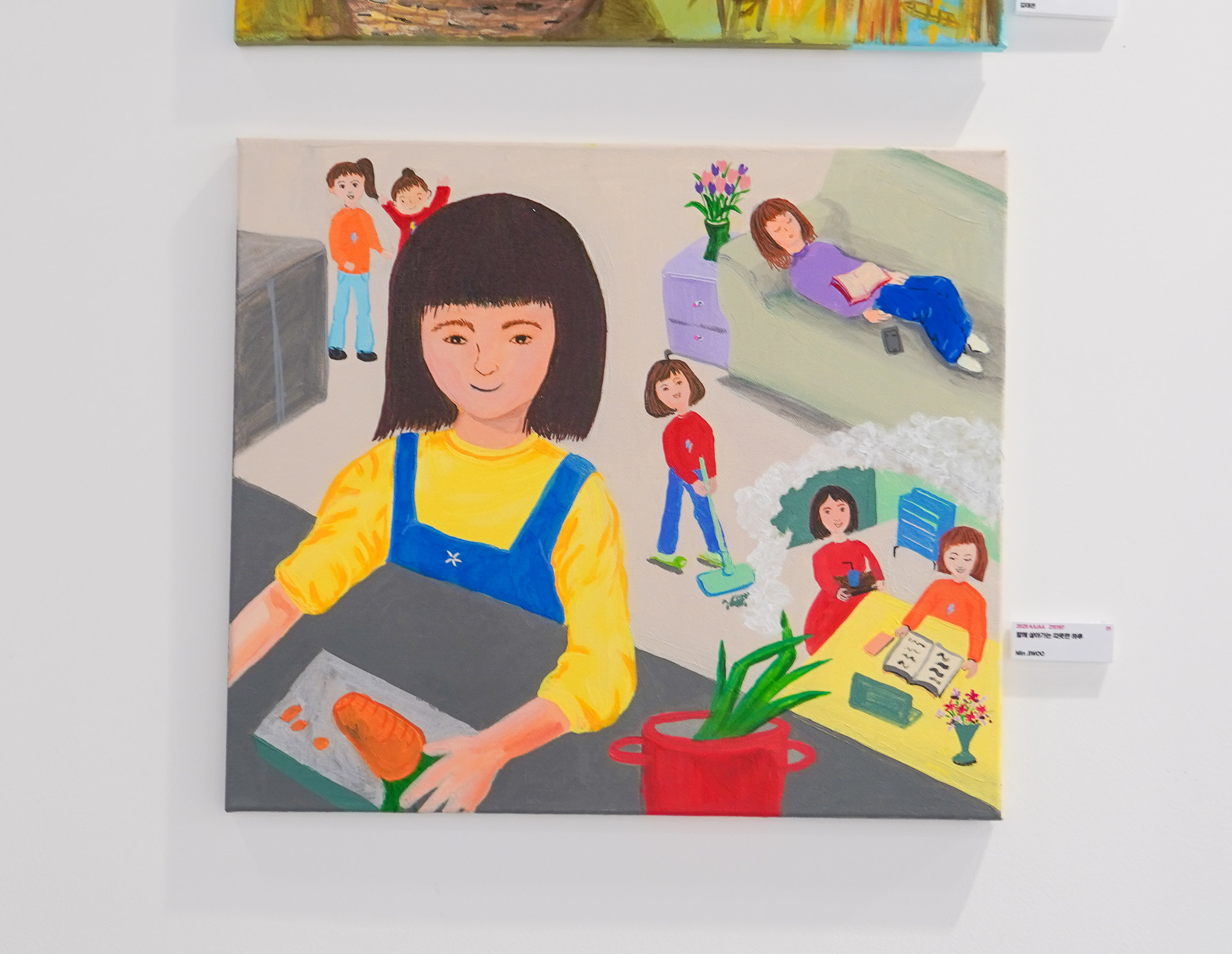우리가 매일 마주하지만 쉽게 알아채지 못하는 서로를 향한 배려와 사랑, 책임감 같은 보이지 않는 마음은 일상의 풍경 속에서도 보입니다. 그림의 중앙에 나는 요리를 하며 미소 짓고 있습니다. 조용히 가족을 위해 무언가를 준비하는 그 마음속에는 ‘사랑’, ‘책임감’, ‘배려’라는 보이지 않는 감정이 담겨 있습니다. 소파에서 책을 읽으며 쉬는 어른의 모습, 청소를 하고 있는 또 다른 아이, 조용히 공부하거나 멀리서 장난치는 아이들까지.. 각자 다른 일을 하고 있지만, 모두가 연결되어 있는 듯한 따뜻한 흐름이 느껴집니다.직접적으로는 말하지 않아도, 서로를 위해 움직이고, 쉬고, 함께하는 마음이 공간을 채우고 있습니다 이처럼 보이지 않지만 서로의 관계 속에서의 정서적 연결을 시각화하여 표현하였습니다