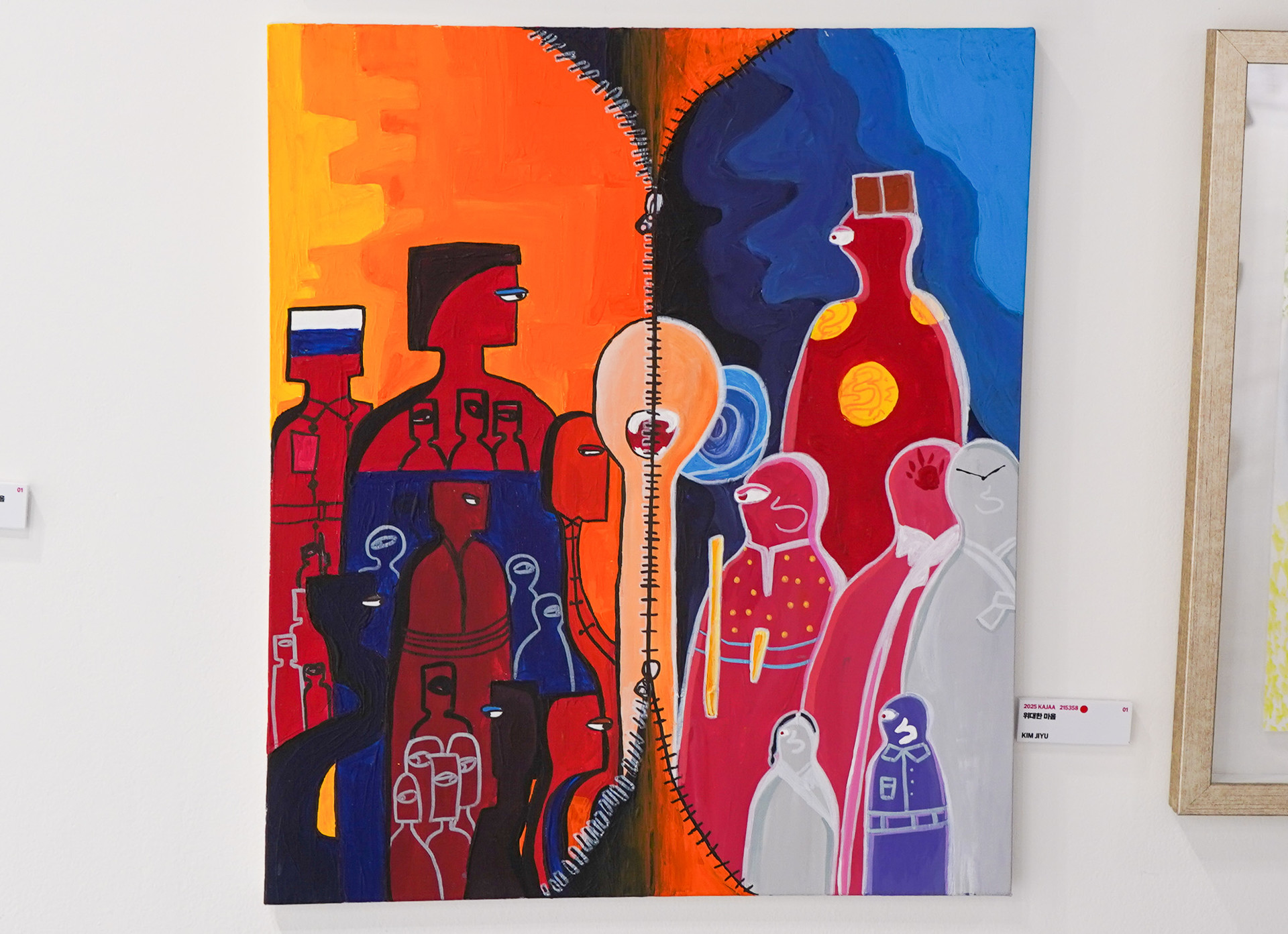이 그림은 우리나라의 역사적 인물들과 우리나라에게 적대적이었던 국가에게서 전해진 마음을 표현한 작품입니다. 왼쪽 그림은 우리나라에게 적대적이었던 국가의 사람들의 모습을 표현하였고, 오른쪽 그림은 우리나라를 사랑하여 지키신 위인들을 표현하였습니다. 왼쪽 배경을 밝게 처리한 이유는 겉으로는 선한 척 하지만 속은 악한 우리나라를 힘들게 했던 나라들의 생각과 마음을 반전을 주는 색감으로 표현했습니다. 오른쪽 배경의 색깔은 적대 국가들이 우리나라에 입힌 악한 피해를 파도와 같이 표현해 보았습니다. 가운데 사람은 나의 모습입니다. 적대 국가들의 악한 마음을 물리치고 우리나라의 위대한 위인들의 후손에게 전해주는 나라 사랑의 마음을 지금을 살고 있는 내가 전달 받는 모습입니다. 지퍼는 마음을 전달하는 매개체입니다. 우리는 지금 그 지퍼를 올릴 수도 내릴 수도 있습니다. 그것은 지금의 우리의 선택에 달려있습니다. 보이지 않지만 위대한 위인들이 전해준 그 사랑의 마음을 활짝 열어 줄 그 지퍼의 키는 지금을 살고 있는 나와 우리가 우리의 후손에게 전해주어야 하는 또 하나의 위대한 마음입니다.