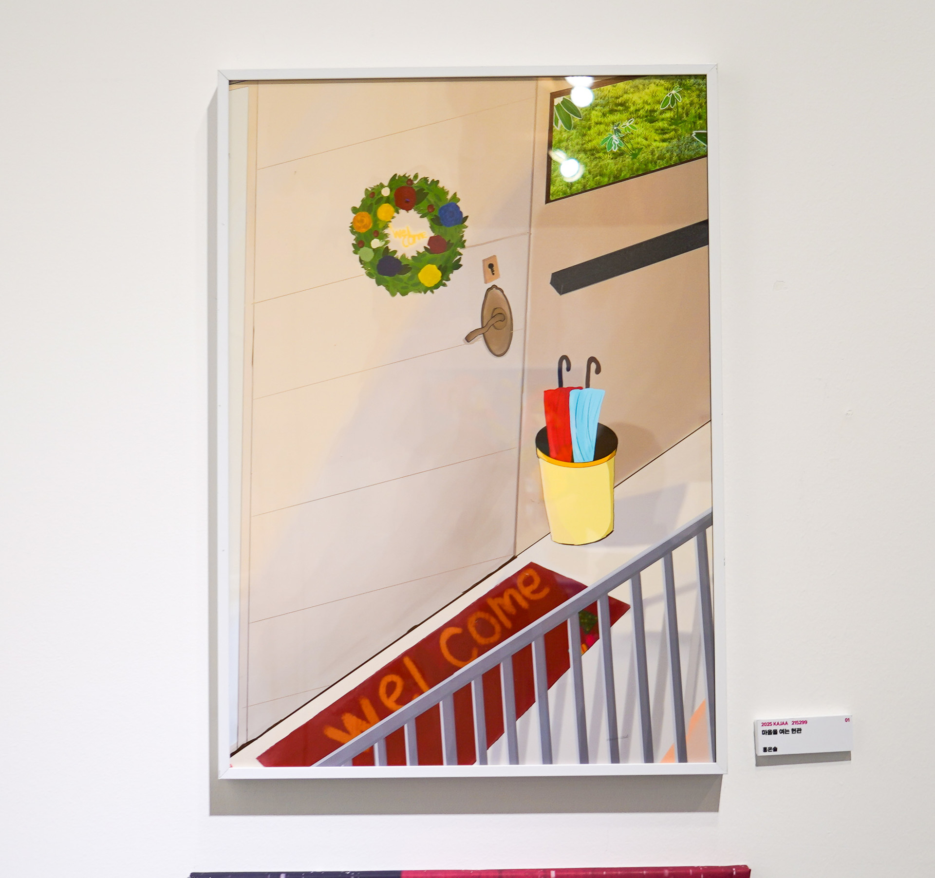 이 그림은 '보이지 않는 곳에서 느껴지는 마음'을 주제로 하여, 내 마음속에 자리 잡은 ‘나를 반겨주는 따뜻한 마음’을 표현했습니다. 배경은 누구나 편하게 들어올 수 있는 현관문 앞으로, 이곳이 바로 나를 환영하는 공간임을 상징합니다. 액자 속 설악초는 ‘환영’이라는 꽃말이 담겨 있어, 내 마음이 따뜻하게 맞이하는 손길을 나타내고 싶었어요. 카펫과 현관문에 걸린 화관, 그리고 'Welcome' 이라고 적힌 곳 들은 모두 나를 기다리고, 환영하는 마음을 담고 있어요. 햇빛이 포근히 내려앉아 우리의 만남이 더욱 따뜻하고 소중하게 느껴지길 바라는 마음을 그림에 담아 보았습니다