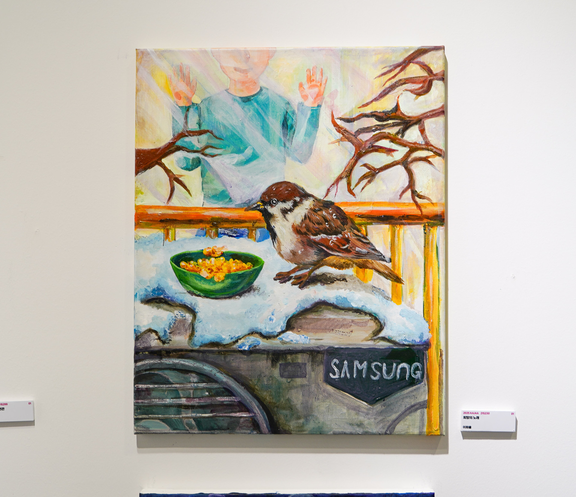 기후위기로 인한 폭우 폭설이 앞으로 더 심각해질 것이란 뉴스를 들었습니다. 올여름의 폭우는 사람들의 삶을 위협했고, 자연도 큰 고통을 겪었습니다. 하지만 여전히 들려오는 매미소리를 들으며, 자연은 스스로 견디고 회복하려는 힘이 있다는 것을 느꼈고, 그 속에서 작은 희망을 보았습니다. 다가올 겨울은 더욱 추워지고, 눈도 많이 내릴 것이라고 합니다. 두터운 눈이 쌓이면 새들은 먹이를 찾기 힘들어집니다. 그래서 저는 봄날 다시 들려올 새들의 노랫소리를 떠올리며, 보이지 않는 따뜻한 마음을 전하고 싶었습니다. 따뜻한 봄 새들의 노랫소리가 추운 겨울을 힘겹게 보낸 이들에게 위로와 희망이 되기를 간절히 바라봅니다. 이 작품에는 추위에 떨고 있는 새, 그 앞에 조용히 놓인 먹이 그릇, 그리고 뒤에서 조심스럽게 지켜보는 아이의 모습을 담았습니다. 직접 드러나지 않아도, 누군가를 향한 따뜻한 마음은 분명히 전해진다는 메시지를 담고 있습니다.
