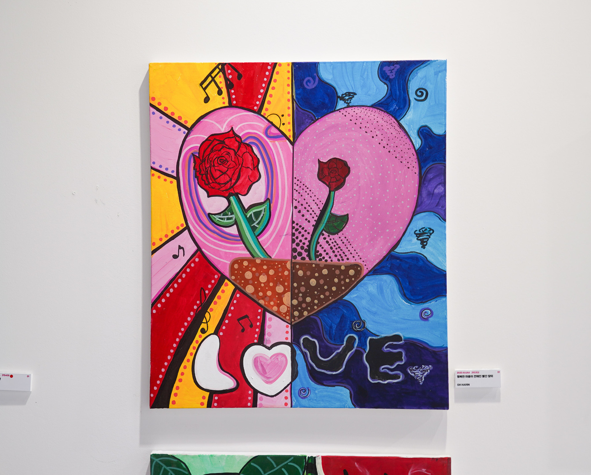 행복을 꽃 피우기 위해서는 따뜻함과 사랑하는 마음이 전달되어야 합니다. 그래야만 꽃은 가장 아름답고 싱그럽게 피어납니다. 저는 그 보이지 않는 마음을 빨간 장미꽃에 비유하였습니다. 마음에서 느끼는 행복과 우울함을 반으로 구분한 하트로 표현하였습니다. 하트 속의 장미는 마음에 꽃이 피어난 것입니다. 빨간 장미꽃의 꽃말인 ‘사랑’은 행복으로 피어납니다. 오른쪽 꽃은 우울함을 표현하는 장미입니다. 충분한 사랑과 행복이 전해지지 못한 장미는 곧 시들고 맙니다. 우울함을 상징하는 꽃으로 표현했습니다. 색깔 표현 또한 행복을 전하는 왼쪽은 따뜻한 색깔들로 우울함을 표현한 오른쪽은 차가운 색깔로 표현했습니다.