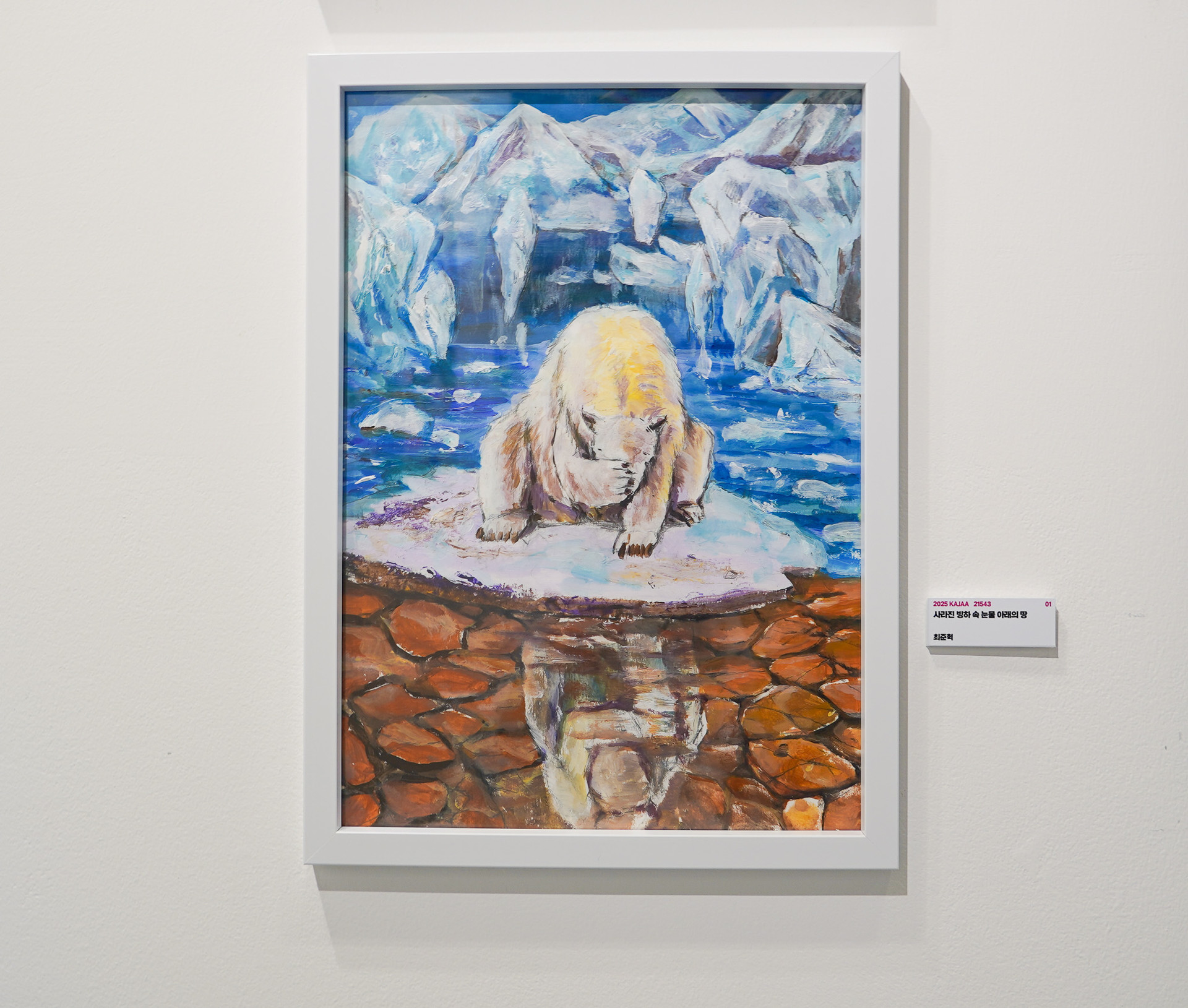 이 작품은 북극곰의 마음을 중심으로 과거, 현재, 미래의 시간을 담아낸 그림입니다. 화면 위쪽의 단단하고 거대한 빙하는 과거의 찬란하고 풍요로웠던 자연을 상징하고, 중앙의 푸른 물결과 점차 녹아가는 얼음은 지금 이 순간, 북극곰이 처한 불안정한 현실을 나타냅니다. 마지막으로 화면 아래에 비친 미래의 모습은 얼음이 모두 녹아 사라지고 매마른 땅 만이 드러난 풍경으로, 북극곰의 터전이 사라져버린 미래의 암울함을 암시합니다. 빙하 위에 쓸쓸히 앉아 한쪽 발로 얼굴을 감싸쥔 북극곰은 슬픔과 혼란, 그리고 절망 속에서도 무언가를 견디고자 하는 마음을 드러냅니다. 그 마음은 단지 생존의 몸짓이 아니라, 시간이 흐를수록 작아져가는 세상 속에서 느끼는 깊은 상실감과 고독을 반영합니다. 이 작품은 보이지 않는 곳에서 북극곰이 보내는 무언의 외침이자, 우리가 외면했던 자연의 마음을 마주하게 합니다.