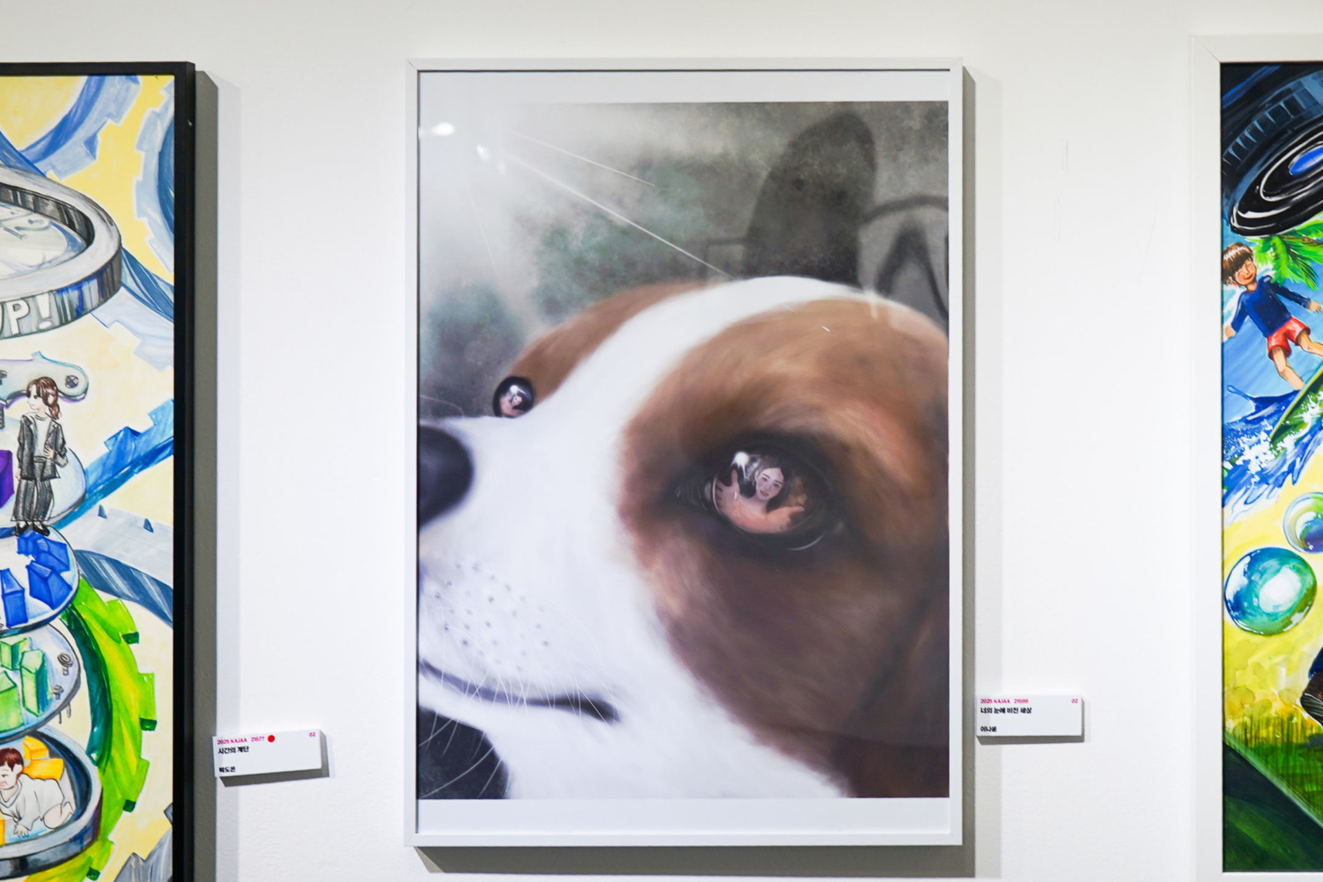 이 작품은 반려견이 주인을 바라보는 시점을 통해, 말이 통하지 않아도 눈빛으로 전해지는 깊은 감정을 표현했습니다. 강아지의 눈에 반사된 주인의 모습은 사랑과 유대의 상징이며, 어두운 배경 속 비치는 빛은 강아지가 주인을 향해 품는 순수하고 긍정적인 마음을 나타냅니다. 이는 동물의 감정이 얼마나 깊고 진실 한지를 보여주는 한 장면입니다.