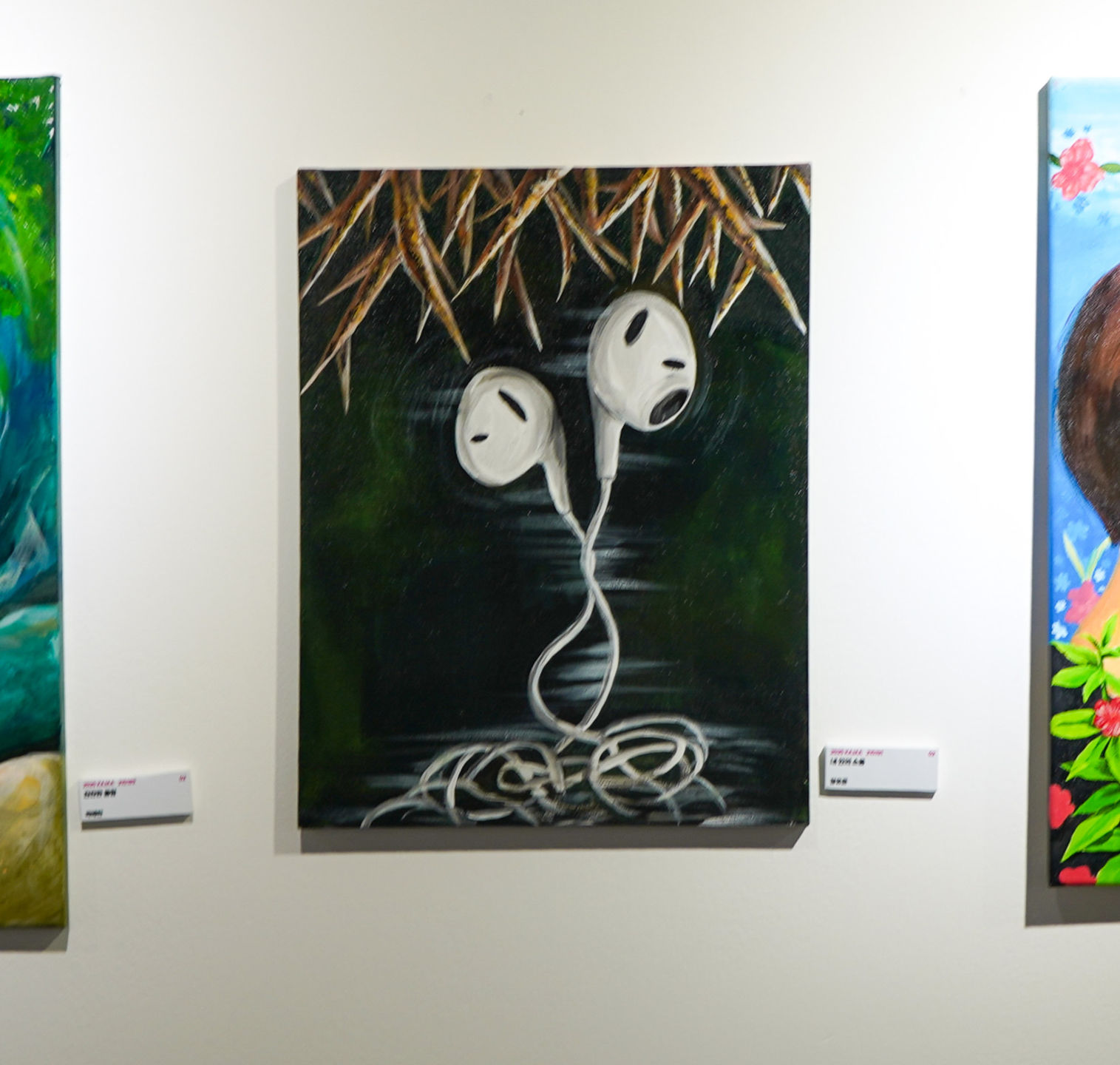 이 작품은 사춘기라는 낯선 시기를 지나며 겪는 감정의 혼란과 내면의 충돌을 이어폰 줄로 표현한 그림입니다. 반항하고 싶은 마음과 한편으론 바르게 성장하고 싶은 마음이 뒤섞이면서, 스스로도 알 수 없는 감정의 소용돌이에 흔들리는 자신을 형상화했습니다. 시간이 지날수록 가족과 마주 앉아 이야기하는 시간은 줄어들고, 대신 방에 혼자 있는 시간이 많아지며 문자나 전화로만 소통하는 날이 늘어나는 현실을 얽힌 이어폰에 담았습니다. 단순한 선이 아닌 꼬인 형태로 표현한 이유는, 부모님과의 관계가 완전히 단절된 것이 아니라 아직 이어져 있다는 희미하지만 분명한 연결의 의미를 담기 위함입니다. 이어폰 아래 날카롭게 뻗은 가시는 사춘기 특유의 날선 감정과 예민한 마음, 쉽게 상처 받는 내면을 상징하며, 말로 표현하기 어려운 성장통을 시각적으로 드러냅니다. 이 작품은 어른이 되어가는 과정에서 느끼는 혼란과 그 속에서도 놓지 않고 싶은 연결을 조용히 이야기합니다.