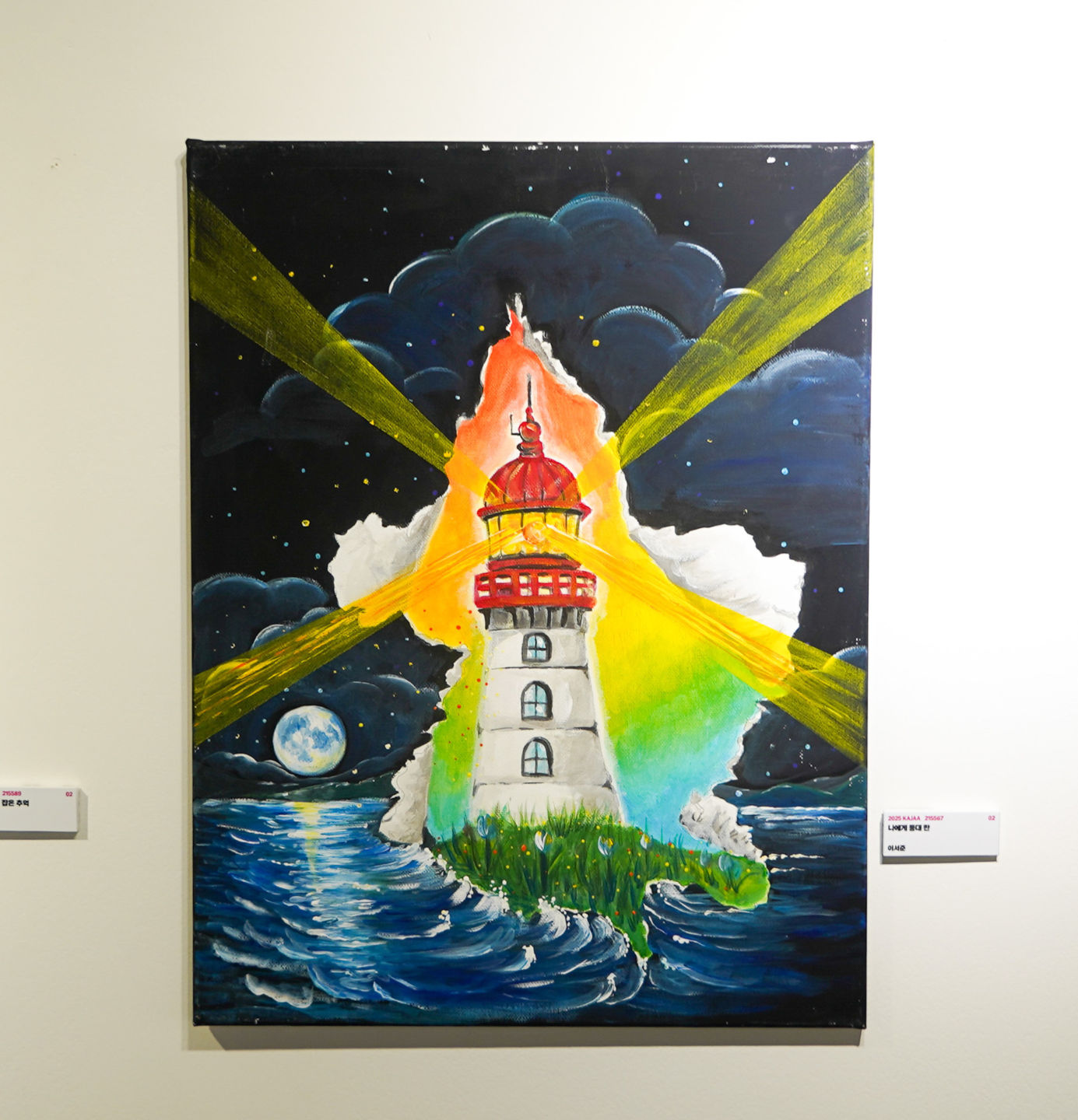 혼란스러운 마음속을 찢고 나온 바다 위의 등대는 나의 감정을 인도해주는 길잡이다. 온통 새까맣고 혼란스러운 마음도 알록달록한 감정들로 채워지도록 도와주는 등대는 나의 미래가 밝아 질 거라는 희망을 암시하는 굳건한 기둥이며, 수면을 아름답게 밝혀주는 보름달은 나의 미래가 희망으로 가득 차 오를 것을 상징하는 그림입니다.