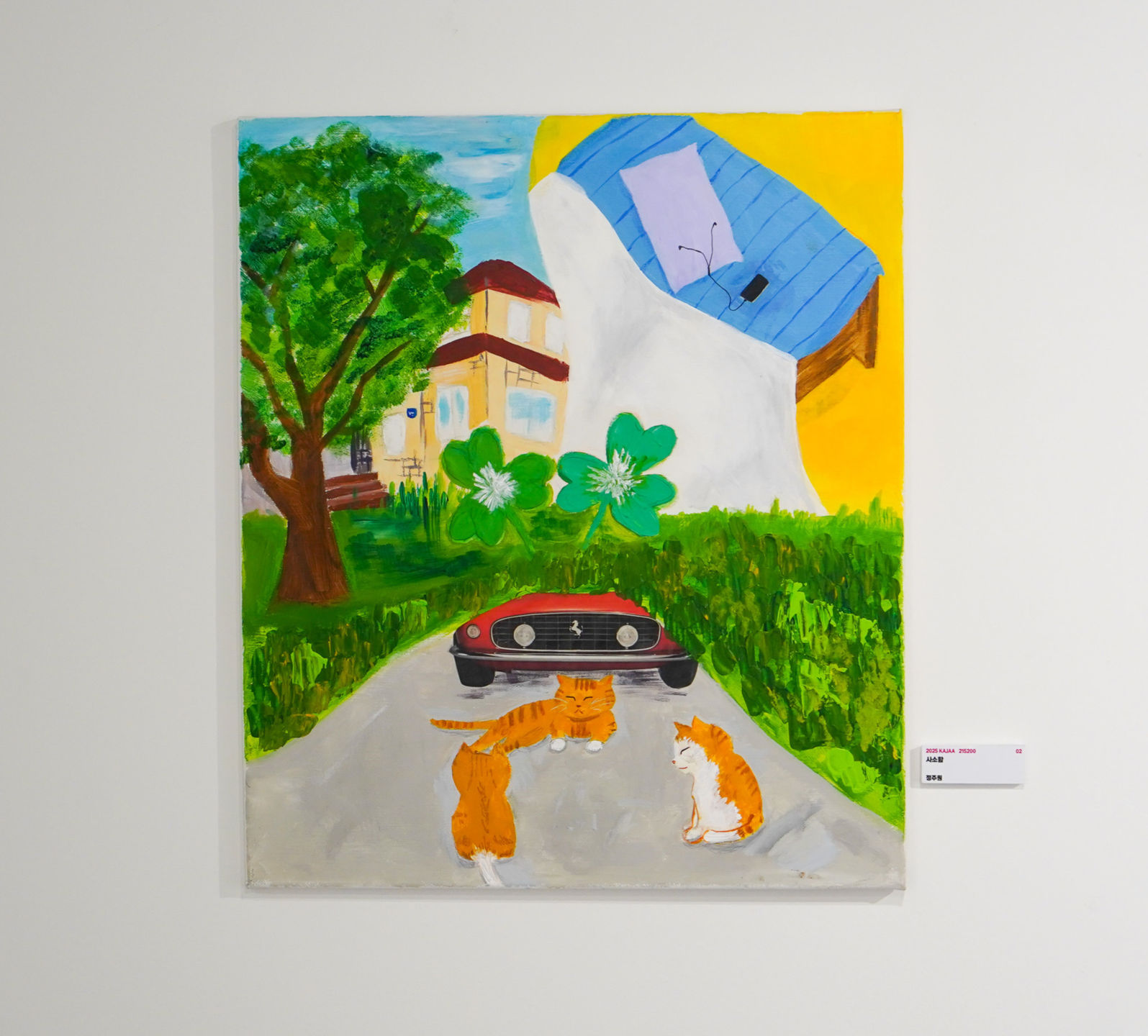 여기에는 제가 행복을 느끼는 순간들을 담았습니다. 가운데에는 행복의 상징물인 세잎클로버를 돋보이게 그려 이 작품이 행복을 표현하고 있다는 것을 나타냈습니다. 또 전체 그림을 세 칸으로 나누어서 제가 행복을 느끼는 순간들을 각각 칸에 그렸습니다. 왼쪽 위 칸에는 제가 사는 집을 그렸습니다. 학교와 학원을 마치고 집에 들어가는 순간은 정말 기분이 좋습니다. 그냥 집에 아무것도 안 하고 누워있기만 해도 정말 행복합니다. 날씨가 좋은 날에는 기분이 더 좋습니다. 그래서 배경을 맑은 하늘로 표현하였습니다. 그 옆 칸에는 제 침대를 그렸습니다. 집에 들어가는 순간보다도 행복한 때가 침대에 딱 누워 핸드폰을 킬 때입니다. 오늘 할 공부를 끝낸 다음 잘 준비를 하고 침대에 누우면 천국에 온 듯한 느낌이 듭니다. 침대 위에 누워 이어폰을 끼고 노래를 듣거나 친구들과 디엠을 하다 보면 시간이 금방 갑니다. 이 칸에는 편안하고 따뜻한 느낌을 주기 위해 배경을 노란색으로 칠해보았습니다. 맨 밑 칸에는 고양이들을 그렸습니다. 저는 고양이를 정말 좋아합니다. 하지만 고양이를 키우지는 않아서 저는 길고양이나 친구네 집 고양이를 보는 것으로 만족해야 합니다. 그래도 다행인 것은 저희 동네에는 길고양이가 많습니다. 고양이를 보면 정말 행복합니다. 귀엽기 때문입니다. 저는 노란 고양이를 좋아해서 수많은 길고양이 무늬 중 노란색 줄무늬 무늬로 고양이를 그렸습니다. 입체적인 차의 느낌을 내고 싶어서 차는 그림으로 그리지 않고 사진을 오려 붙였습니다. 바닥을 검정색 아스팔트 바닥으로 하면 어두운 분위기가 날 것 같아 시멘트 색으로 바닥을 칠했습니다. 작품에 전체적으로 편안한 분위기를 주기 위해 초록색의 비율을 높게 했습니다. 이 작품의 제목은 ‘사소함’입니다. 저는 행복이 그리 거창한 것이 아니라 아주 사소하고 작은 순간들 속에 숨어 있다고 생각하기 때문에 이렇게 제목을 짓게 되었습니다.