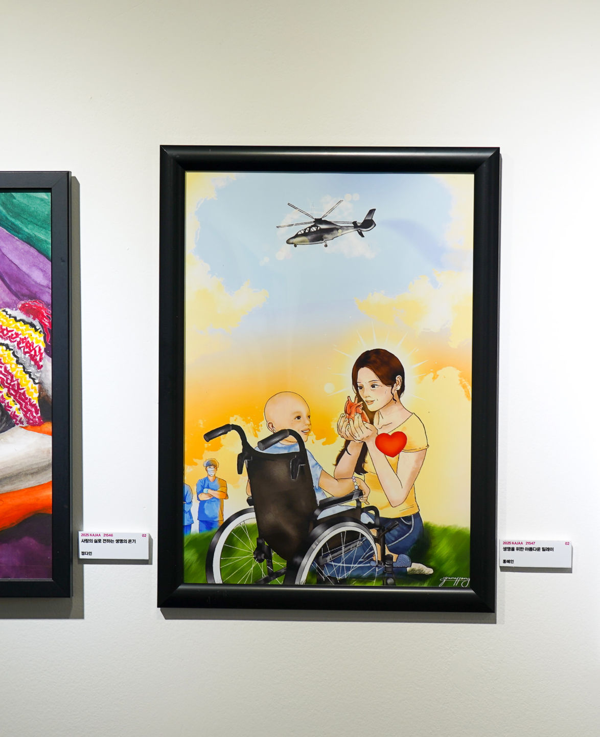 눈에 보이지 않지만 아름답게 전달될 수 있는 사랑을 생각해 보았습니다. 그리고 타인의 생명을 살리기 위해 기쁜 마음으로 희생할 수 있는 인류애적인 사랑, 바로 ‘장기 기증자’를 떠올렸습니다. 그 과정에서 의료적인 도움을 주며 생명을 살리는 데 힘쓰는 의료인들의 헌신도 함께 생각하게 되었습니다. 우리는 장기를 기증한 분들을 직접 만날수는 없지만, 그분들의 사랑은 우리 안에서 계속 숨 쉬고 있습니다. 생명 나눔의 가치를 깨닫고, 장기 기증에 동참하는 아름다운 사회가 되길 진심으로 희망하는 마음을 작품에 담았습니다.