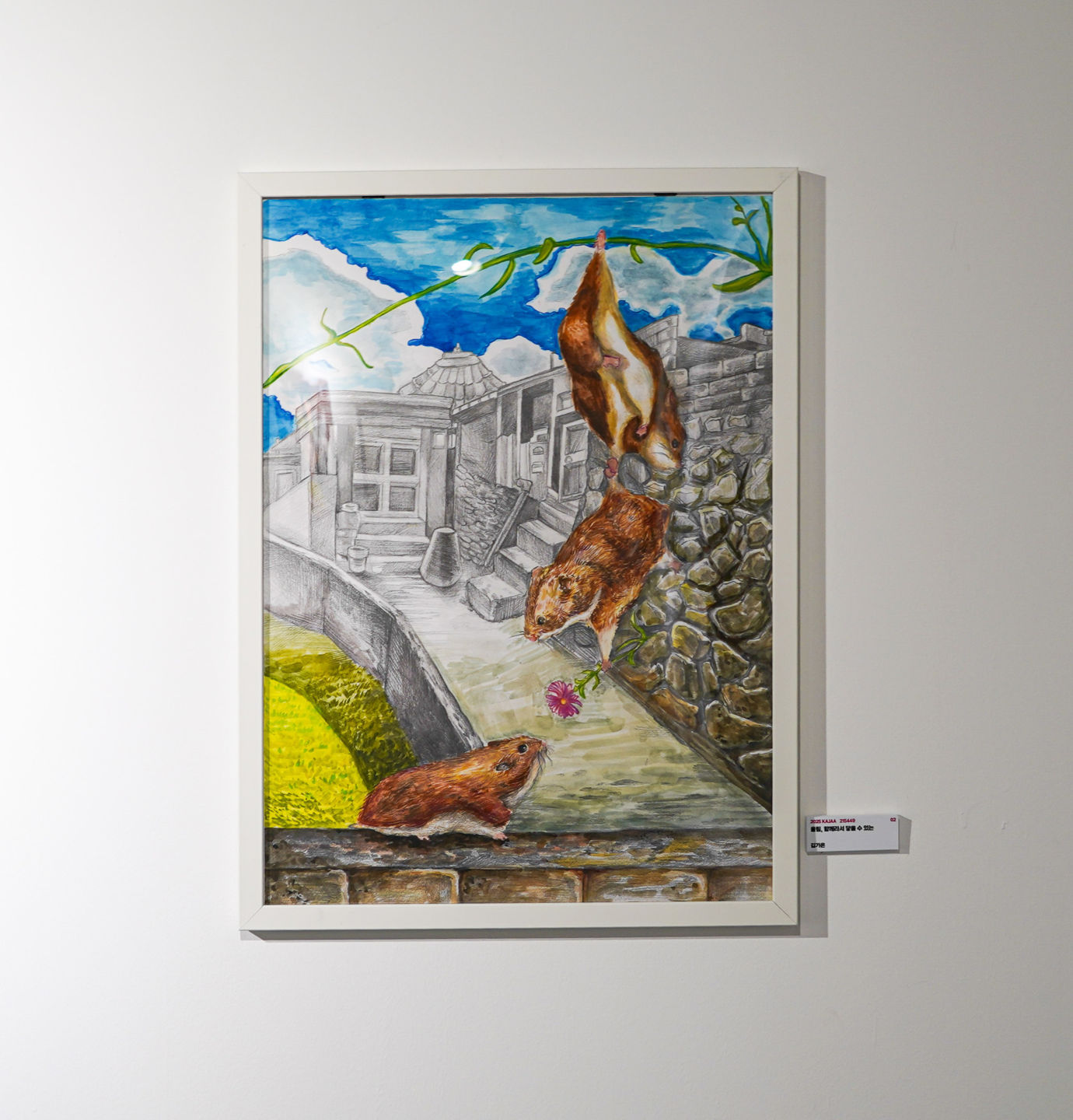 시골의 정취가 남아 있는 고요한 도시, 낡은 벽돌 건물 사이에서 세 마리의 쥐가 작지만 깊은 감동을 전하는 장면을 연출합니다. 위에서는 두 마리의 쥐가 온 힘을 모아 서로를 붙잡고, 아래에 있는 친구에게 정성껏 준비한 꽃 한 송이를 건넵니다. 이 장면은 연약한 존재일지라도 서로를 향한 배려와 협력이 얼마나 큰 아름다움을 만들어낼 수 있는지를 보여줍니다. 작은 생명체 사이에서 피어나는 우정과 연대는, 때로 거대한 세상 속에서도 가장 따뜻한 빛이 됩니다. “진짜 공감은 꼭 눈에 보이는 사람한테서만 오는 걸까요?” 자그마한 꽃을 들고 있는 이 쥐도 조용하고 작은 존재들도, 사실은 다른 사람들의 마음을 더 잘 느끼고 있었을지도 모릅니다. 가끔은 보이지 않는 곳에서 전해지는 마음이 더 크게 다가올 때가 있고, 그런 마음 이 누군가에게 큰 힘이 될 수도 있다고 생각합니다.