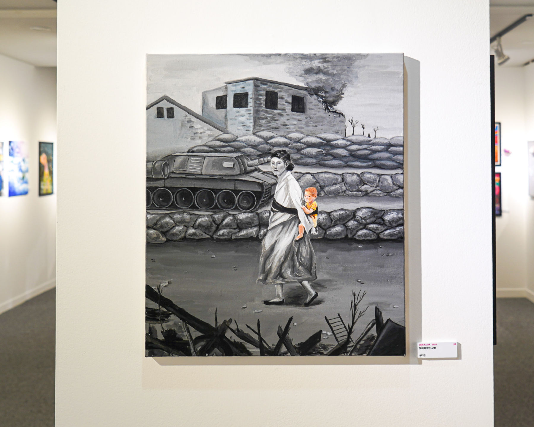 이 작품은 전쟁 중에 아이에게 보이지 않는 어머니의 희생과 사랑을 표현한 그림이다. 그림 속 아기는 아직 너무 어려 커서 어머니의 희생을 보진 못했지만, 아이의 존재 자체가 어머니의 사랑을 증명한다는 메시지를 담고 있다. 그림 속 아기를 제외한 모든 배경을 흑백으로 표현했으며 이는 아이는 이 전쟁에 기억에 머물러있지 않을 거라는 것을 상징한다.
