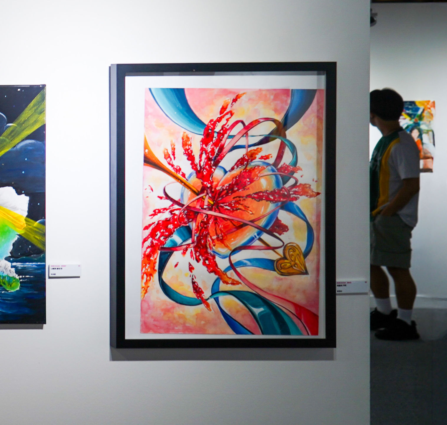 마음에서 터져 나오는 감정의 소용돌이로 누구에게나 있었던 '첫 기억'에 대한 다양한 감정들을 표현하고자 했다. 화면 중심에는 유리처럼 투명한 심장은 아직 때묻지 않은 순수함을 상징하며, 처음으로 물들기 시작한 마음 평온한 형태로 머무르지 않는다. 심장을 관통한 큐피트 화살에서 부터, 거세게 튀어오르는 붉은 물감은 마치 감정이 터지는 순간을 형상화한 듯 뿜어져 나옵니다. ‘처음’이라는 낯섦이라는 감정은 정확한 단어로 표현할 수 없다. 그 주위를 휘감고 있는 푸른 리본과 붉은 리본은, 감정의 흐름과 시간의 흐름을 상징하며 많은 감정이 뒤엉킨 모습을 표현한다. 첫 기억은 아름답지만 어딘지 모르게 아련하고, 붉지만 차갑고, 찬란하지만 상처를 남기는 그 복합적인 감정이 배경 안에 녹아 있다.