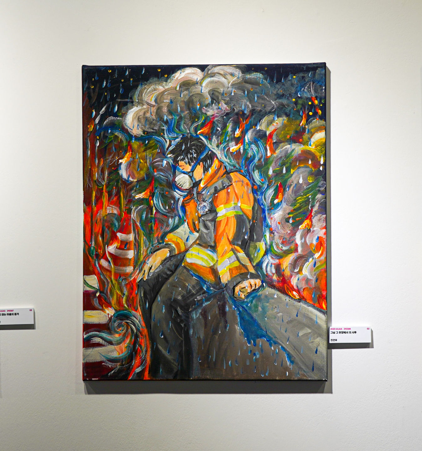 기후 위기는 점점 우리 가까운 곳에서 자연 재해로 나타나기 시작 하였습니다. 홍수와 산불로 최근 많은 사람들의 소중한 생명과 재산이 사라졌으며, 아름다운 명소와 문화재들 마저 흔적도 없이 사라지는 그 현장에서는 상상도 못할 극한의 노동력으로 소중한 생명과 재산을 지키기 위해 혼신의 힘을 다하시는 고마우신 분들이 항상 존재하였습니다. 강한 바람을 타고 이리저리 옮겨 다니는 불씨가 다시 큰 산불을 만들고 그 산불이 또 민가를 덮치는 악순환 속에서 비가 내리는 기적 같은 순간 모두 안도하고 환호하던 모습을 뉴스로 접하였습니다. 그분들의 용기와 헌신에 감사함을 느낀 인상적인 장면을 그림으로 그렸습니다.