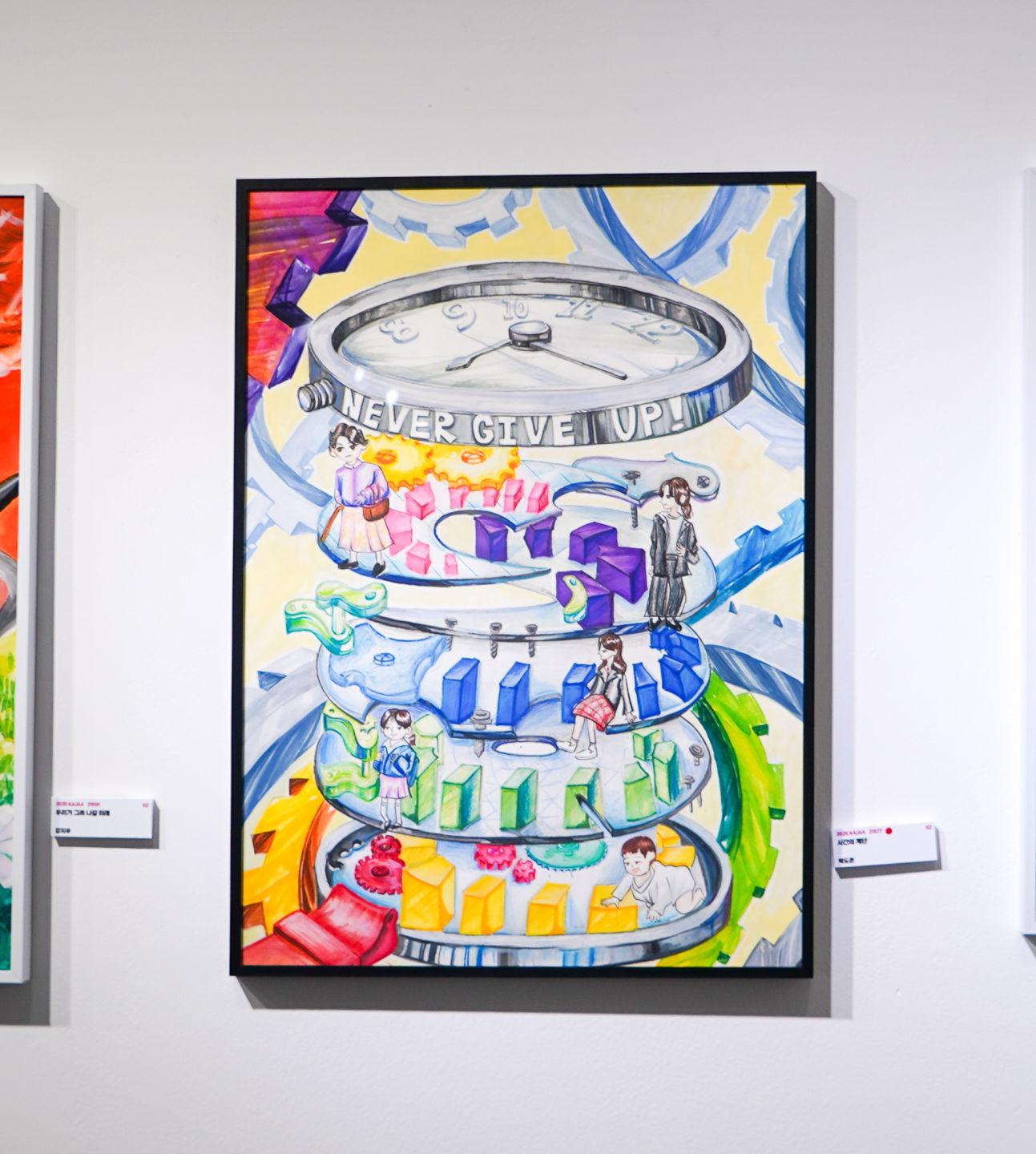 거대한 시계 안에서 여자아이가 올라가고 있으며 시계 속의 소녀의 삶은 인생의 여정을 이야기합니다. 여자아이기 계단 위를 올라가며 성장하는 이 모습은 삶의 단면을 의미하며 도미노를 통해서 강 층마다 겪어야 할 시련, 선택, 후회를 반복하며 성찰의 단계를 반복하며 삶을 사는 것을 나타냅니다. 삶을 살면서 항상 벽을 마주하게 됩니다. 그럴때마다 보이지 않는 미래의 나를 떠올리며 포기하지 않고 벽을 넘어야 성장을 할 수가 있습니다. 그래서 도미노를 그려넣어 장애물이자 자신을 돌아보게 만드는 거울로 나타나어서 어떠한 선택을 하다라도 그의 진정한 의미를 다시 되새긴다는 뜻을 담았습니다. 마지믹으로 ‘NEVER GIVE UP!’이라는 문구를 넣어 벽을 마주했을때 포기하지 말고 끝까지 도전하라는 의지를 나타냈습니다.