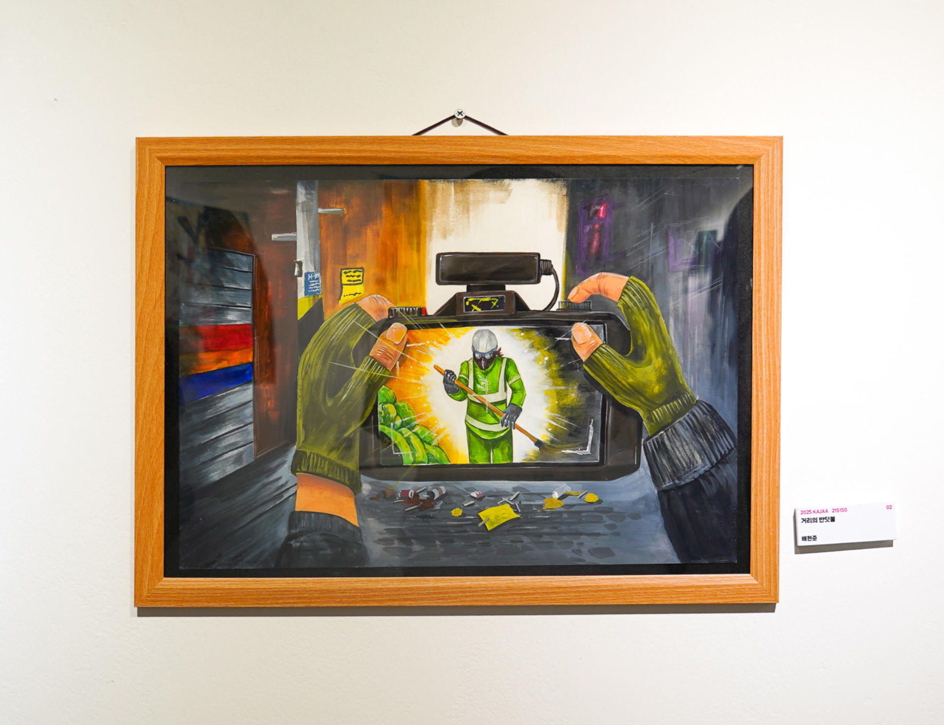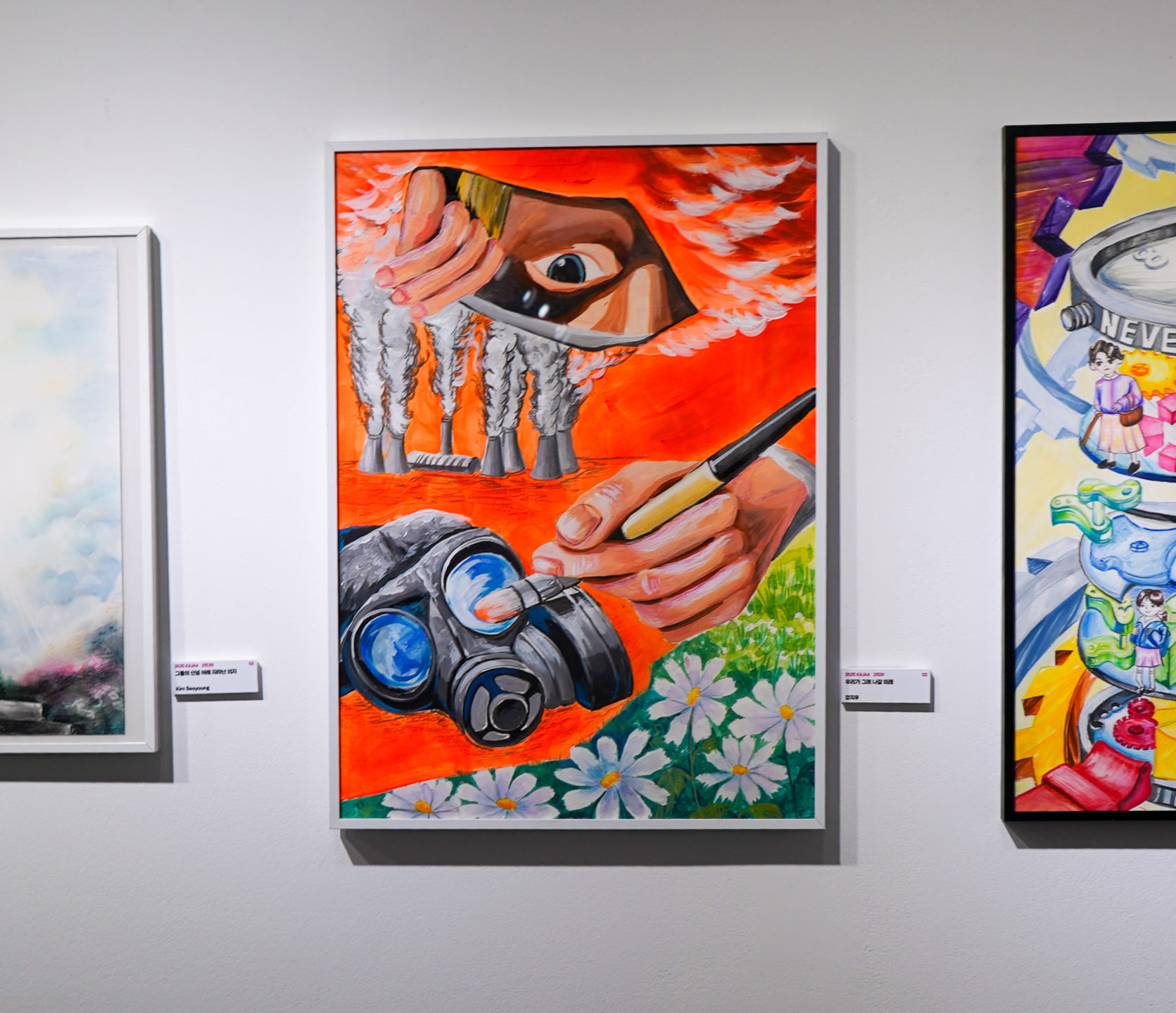 오늘 날 인류가 직면한 환경오염의 심각성과 인간의 무의식적인 인식을 상징적으로 표현한 그림입니다. 화면 위쪽에는 붓으로 그린 굴뚝과 검은 연기가 등장하는데 이는 인간이 만들어낸 오염을 상징합니다. 이는 인간이 마치 예술처럼 오염을 ‘창조’하고 있다는 아이러니한 상황을 상징함과 동시에, 마치 예술작품을 그리듯 붓으로 연기를 그려내는 모습은 인간이 파괴의 흔적마저 무의식적으로 미화하며 외면하고 있는 현실을 보여줍니다. 그리고 그 속에서 화면을 뚫어 바라보는 눈이 등장하는데, 이는 오염된 현실을 바라보며 외면하고 싶지만 끝내 외면하지 못하는 인간의 양심을 형상화한 것입니다 그 아래, 또 다른 손은 방독면 위 렌즈를 덧칠하며 새로운 시선을 입히고 있습니다. 이는 오염된 현실조차 ‘아름답다’고 믿고 싶은 인간의 심리와, 불편한 진실을 가리고자 하는 인간의 욕망을 담은 시선입니다. 그러나 그 손에 쥔 붓이 향하는 곳은 꽃과 푸른 들판, 맑은 자연입니다. 이는 결국 인간의 선택에 따라 미래는 달라질 수 있음을 말합니다. 이 작품은 묻고 있습니다.“우리는 어떤 세상을 그려나가야 할 것인가?”붓을 쥔 손은 바로 우리 모두의, 또 각자의 선택입니다. 더 이상 보이지 않는 곳에서 외면하거나 침묵하지 말고, 자연과 공존하는 미래를 그려나가야 할 때입니다.