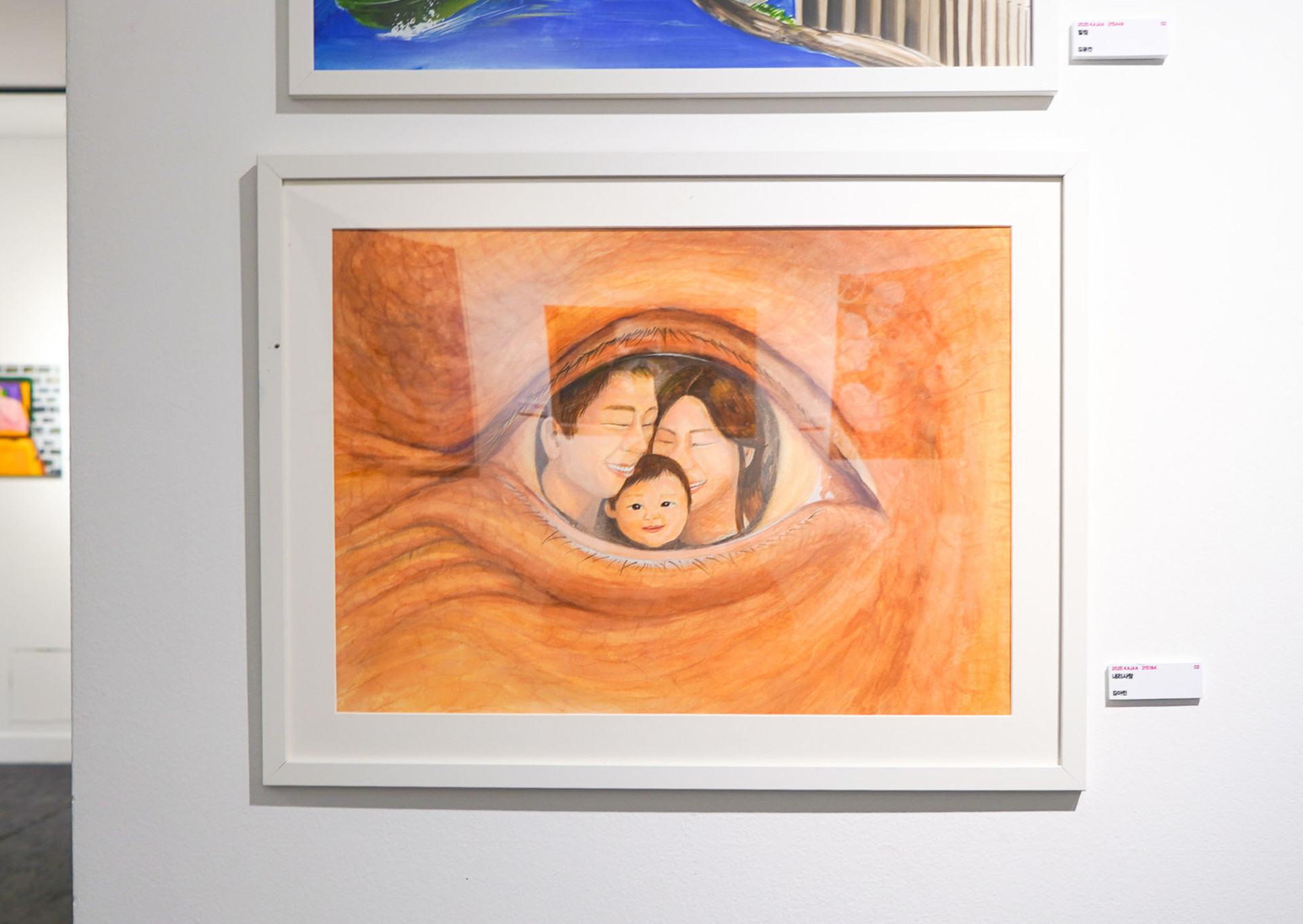 ㅁ이 작품은 나이든 부모의 주름진 눈 속에 비친 자식과 손주의 모습을 통해 ‘내리사랑’을 표현한 감동적인 장면입니다. 주름진 눈가와 깊은 피부결은 자식을 위해 흘려온 세월과 희생을 상징하고, 그 안에 담긴 가족의 환한 미소는 부모의 시선 속에서 언제나 빛나는 존재임을 보여줍니다. 사랑은 말없이 전해지며, 부모의 눈은 평생 자식만을 바라봅니다. 이 작품은 세대를 잇는 따뜻한 사랑의 깊이를 섬세하게 담아냈습니다 할머니의 눈썹과 입모양을 그리지 않은이유는 감상하는 사람의 감정이입을 시키기 위함 입니다.