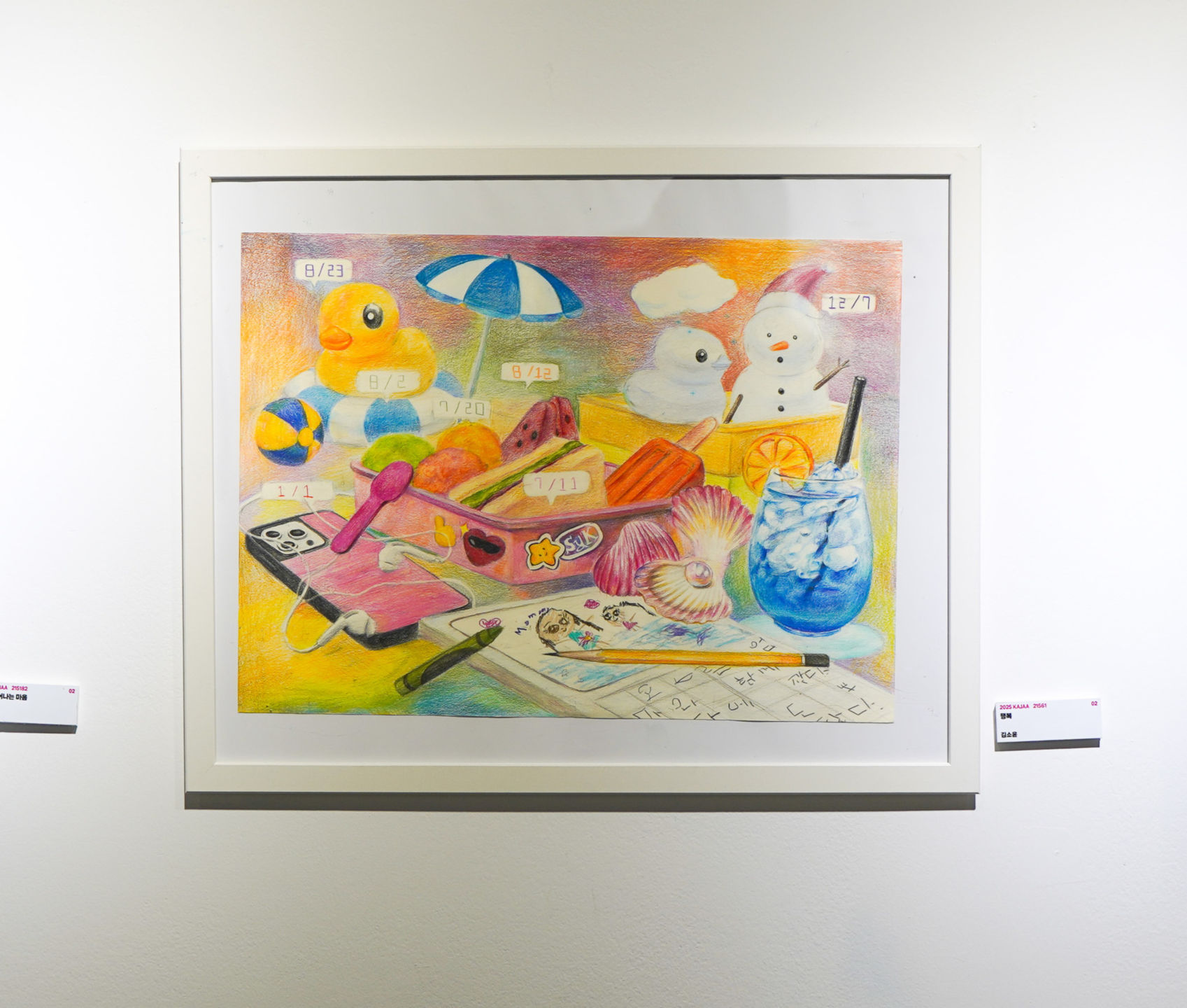 진정한 행복이란 무엇일까요? 행복이란 너무나도 다양한 형태를 띄고 있고 그 형태는 이 지구에 있는 모든 생명체들에게 다른 방식으로 나타납니다. 제가 이 그림을 통해 사람들에게 알리고 싶었던 가장 큰 주제는 남들에게는 보이지 않지만 나만은 알수있는 보이지 않는 행복입니다. 저 그림속에 있는 제 추억이 깃든 소소한 물건들로 남들은 아무것도 아니라고 생각할수있지만 나는, 적어도 저는 저것들을 보며 행복하다라는 감정을 느낄수있습니다. 제가 행복했던 순간들을 그림으로 나타내어 감정이 전해지게 하였고 ,아직도 세세히 기억나는 하나하나의 장면들의 날짜를 적어 그림을 완성시켰습니다. 그림을 그리면서도 느꼈습니다, 보이지 않는 행복하다는 감정을.