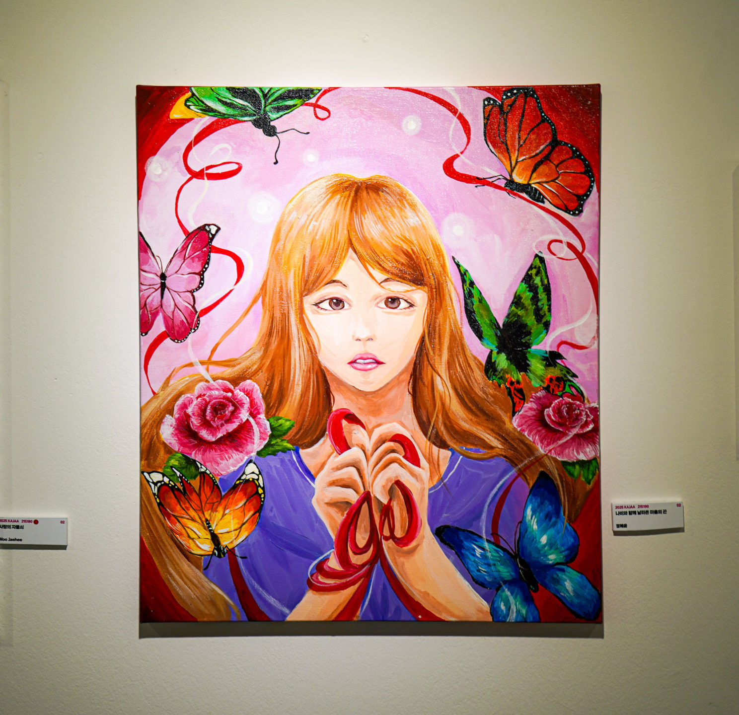 이 작품은 소녀의 마음속 감정이 나비와 붉은 끈을 통해 전달되는 순간을 섬세하게 표현한 그림입니다. 소녀가 두 손으로 감싸 쥔 붉은 끈은 마음을 전하고 싶은 간절한 감정을 상징하며, 그 끈을 따라 날아오르는 나비들은 사랑, 용기, 설렘 같은 다양한 감정을 실어 나르는 존재로 그려졌습니다. 장미는 피어나는 감정의 깊이를, 몽환적인 보랏빛 배경은 그 감정이 머무는 마음의 공간을 표현합니다. 말로는 쉽게 전하지 못했던 진심이 나비의 날갯짓처럼 조용히 퍼져가고, 서로를 향한 마음은 눈에 보이지 않아도 분명히 이어져 있음을 암시합니다. 작품 속 소녀는 그 모든 감정을 끌어안은 채 조용히 바라보며, 마음의 끈이 닿기를 기다립니다. 이 그림은 사랑을 전하고 싶은 순간의 망설임과 떨림, 그리고 마음 깊은 곳의 소망을 시각적으로 담아낸 작품입니다.