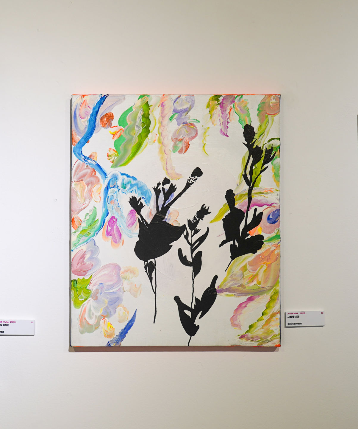 이 그림은 말로 설명할 수 없는 감정을 색과 형태로 표현한 작업이에요. 검은 그림자는 꽃과 식물, 생명을 닮았지만 그 모습은 조용하고 단단해요. 아무 말도 하지 않지만, 그 안에는 많은 이야기와 마음이 담겨 있어요. 반대로 배경은 자유롭게 흘러가는 색으로 채워져 있어요. 파도처럼 출렁이고, 구름처럼 흘러가고, 꽃처럼 피어나는 색들은 기쁨일 수도 있고, 불안이나 기대, 사랑일 수도 있어요. 저는 가끔 이런 생각을 해요. 우리가 겉으로 보이는 모습은 검은 실루엣 같지만, 그 안에서 흐르는 마음은 이렇게나 다채롭구나. 조용한 그림자와 감정의 색은 서로 부딪히지 않고, 하나의 화면 안에서 조화롭게 어울려요. 겉모습과 내면, 침묵과 감정, 어두움과 빛이 서로를 이해하고 받아들일 때, 우리는 더 깊은 연결을 느낄 수 있어요.