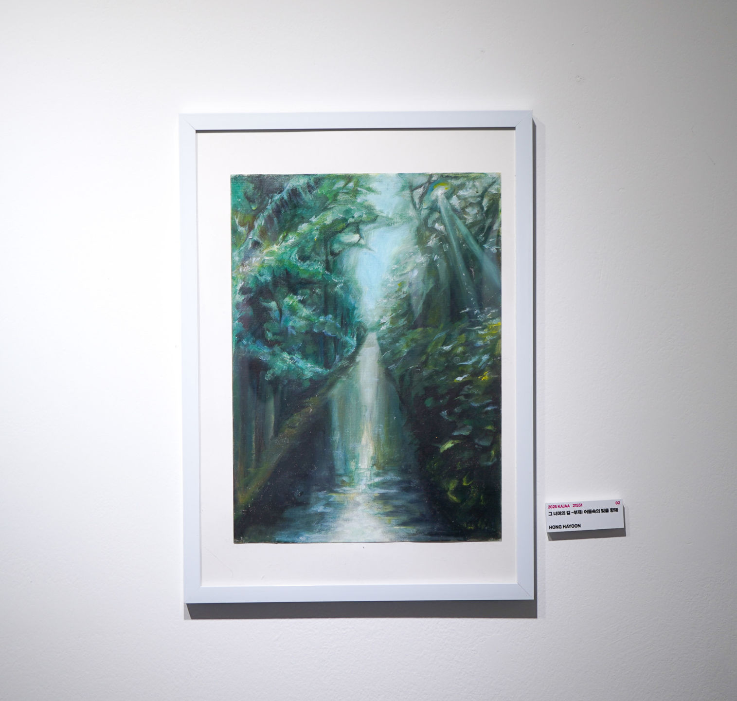 우리가 청소년들에게 ‘지금 너는 어디에 있니?’라고 묻는다면 이 숲속을 가르킬지도 모릅니다 짙은 녹음과 어둠속, 한줄기 희미한 빛만이 길을 인도합니다 이작품은 ‘보이지 않는 세계’가 외부가 아닌 , 자신안에 내면의 숲을 걸으며 ‘나는 누구인지“ ”어디로 가고 싶은지“ 무엇을 위해 살아가는지” 질문을 하게 만듭니다 이 질문은 수풀처럼 얽혀 있지만 그 한가운데 언제나 빛을 향한 방향이 존재합니다. 이는 청소년기의 정체성과 미래에 대한 불확실, 그리고 그속에서 피어나는 내면 탐색의 여정을 상징합니다 “보이지 않는 세계는 어쩌면 가장 솔직한 나 자신일지도 모른다. 그길을 혼자 걷는 것처럼 느껴져도 이 작품을 보는 사람들도 곁을 함께 걸어주길 바라는 마음을 담았습니다