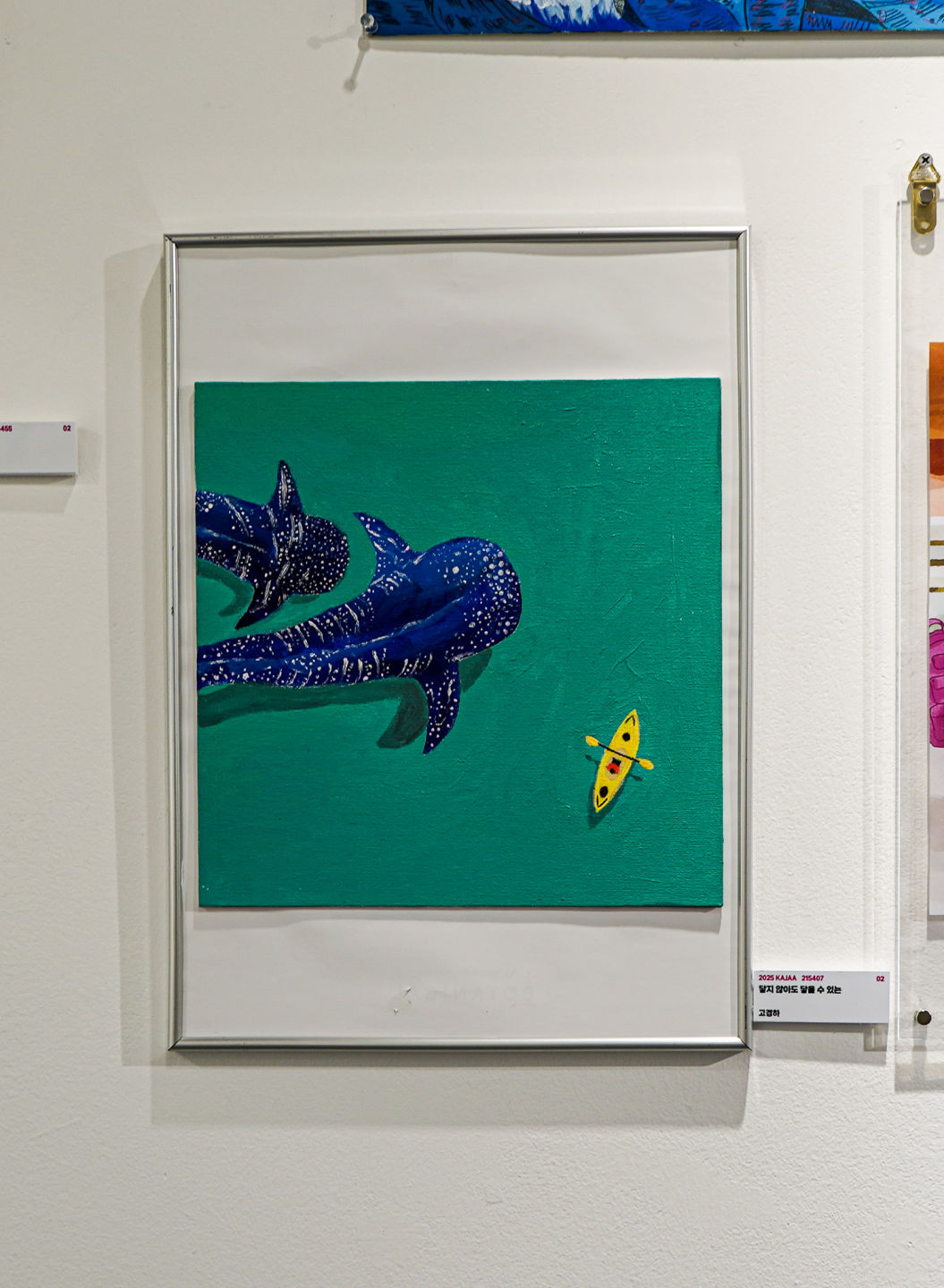 이 그림은 파란 바다 속을 유영하는 두 마리의 고래상어와 노란색 카약을 탄 한 사람을 담고 있습니다. 생물과 인간의 크기 차이, 거리감, 그리고 고요한 색감이 주는 분위기에서 우리는 '눈에 보이지 않지만 분명히 존재하는 마음'을 느낄 수 있습니다.