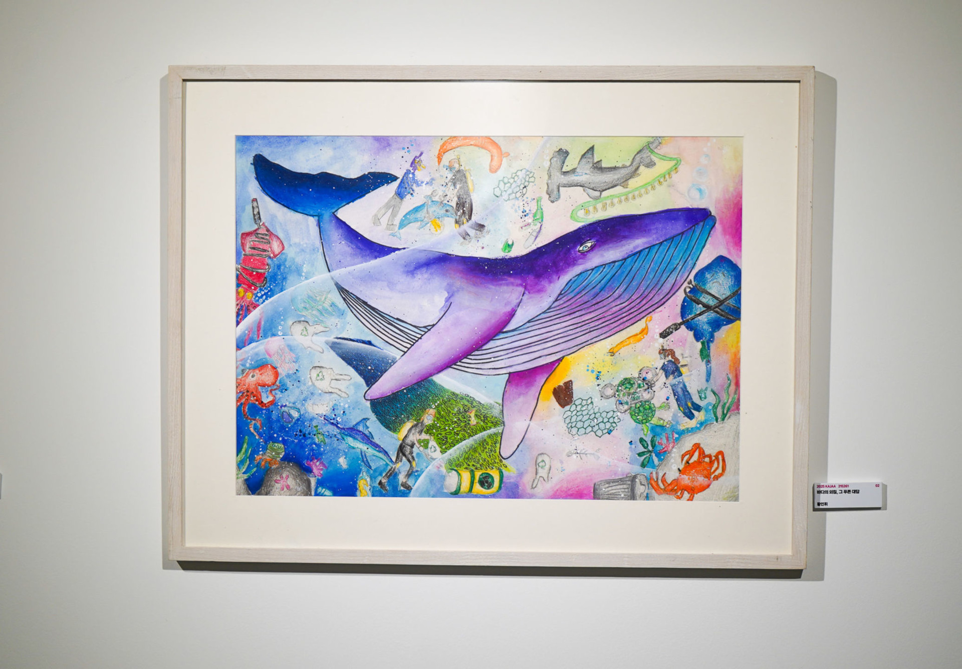 이 작품은 바다 속 해양 생태계와 오염, 그리고 인간의 활동이 해양 생태계에 어떤 영향을 끼치는지 감성적으로 표현한 작품입니다. 한 마리의 커다란 고래를 중심으로 해양 생태계의 아름다움과 그 속에서 무너져가는 현실, 또 그것을 지키기 위해 노력하는 인간의 모습을 동시에 담고 있습니다. 푸른 고래는 바다의 수호자처럼 큰 형태와 다채로운 색채로 화면을 가로지르고 있으며, 그 주변에는 다양한 해양 생물들과 인간이 바다에 남긴 오염물질을 청소하는 장면들이 공존하여 인간의 행동은 선의와 무책임이 섞여 있음을 표현했습니다. 전체적으로 수채화의 부드러운 터치와 번지기 기법을 활용했습니다. 더불어 색연필과 오일 파스텔을 이용해 강렬한 색채 대비를 이끌어내어 바다의 아름다움과 그 안에서 고통 받는 생명들을 묘사했고, 보이지 않는 곳에서 인간이 바다를 지켜내려고 노력하는 모습을 표현한 작품입니다. 지키려고 노력하는 인간의 마음이 바다에 전해져 광활하고 아름다운 바다가 영원히 보존되길 간절히 바라봅니다.