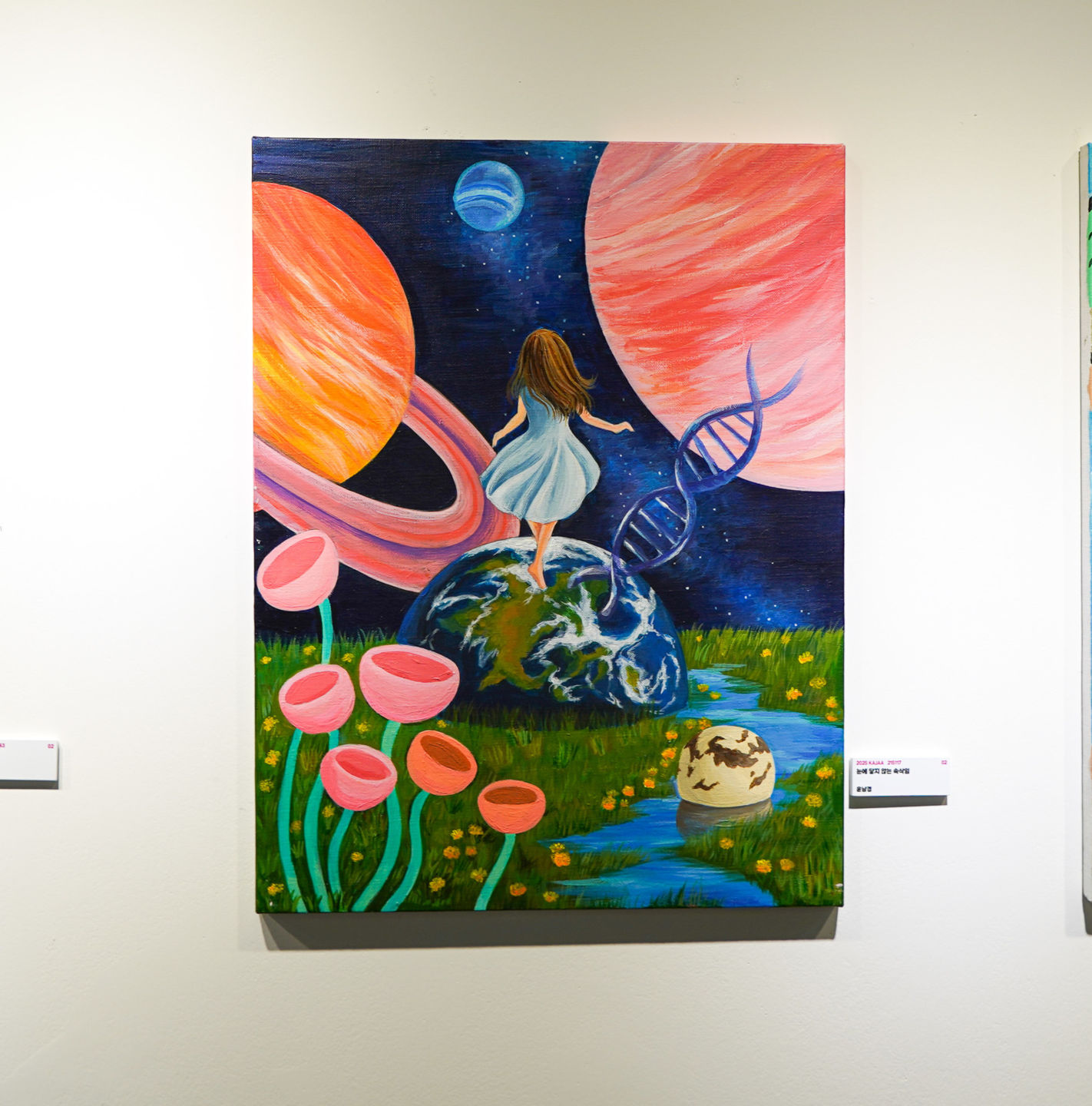 제 작품은 보이지 않는 곳이 보이지는 않는 마음이 전달된다는 것을 알려주고 있습니다. 이 작품에 있는 보이지 않는 마음은 그림 안에 있는 소녀를 어떤 신비한 길로 인도하고 있습니다. 소녀는 눈앞에 펼쳐진 신기한 광경과 마주하고 있습니다. 소녀의 주변에 있는 DNA는 사다리같이 생겼으며 마치 보이지 않는 마음이 생명과 우주를 연결하고 있다는 것을 보여줍니다. 이것은 누군가의 마음이 어떤 세계를 다른 세계랑 연결해서 그것이 꿈과도 이어질 수도 있다는 것입니다. 이 작품 안에 들어있는 보이지 않는 곳에서 마음이 생명과 다른 현실과 꿈도 이어지는 근원이라고 할 수 있습니다. 이것으로, 보이지는 않는 곳에 전해지는 누군가의 마음은 많은 것들을 이어줄 수 있다는 것입니다.