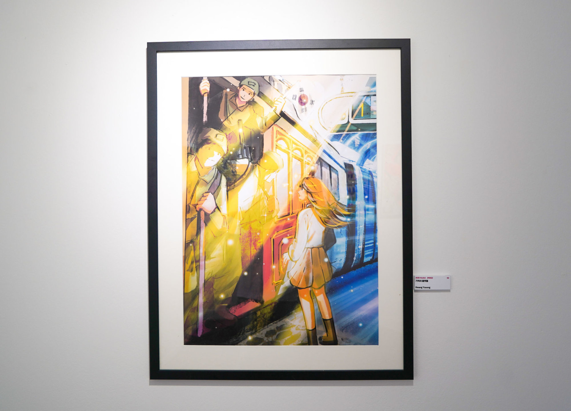 1. 이 작품은 ‘과거와 현재의 만남’을 주제로, 세대 간의 기억과 감정의 연결을 그려낸 디지털 일러스트입니다. 작품 속의 배경은 지하철 플랫폼으로 보이지만, 그곳에 정차한 열차는 현재가 아닌 과거의 군인들이 타고 있는 오래된 열차입니다. 이는 현재의 공간에 과거가 스며든 상징적인 장면으로, 시간의 경계를 넘어 기억과 존경, 그리고 평화를 향한 감사의 메시지를 담고자 했습니다. 현대의 소녀는 과거를 마주하는 ‘현재 세대’를 상징합니다. 소녀는 과거의 군인들과 눈을 맞추고 조용히 서 있으며, 이는 단순한 역사 교육을 넘어 감정적 공감과 세대 간의 대화를 표현한 것입니다. 2. 작품 구성 및 표현 기법 상징적 색채 사용: 따뜻한 황금빛은 과거의 추억과 희생을, 푸른 빛은 현재와 미래를 의미하며, 두 시간대의 만남을 감각적으로 표현합니다. 디테일 요소: 태극기는 민족적 정체성과 자긍심을 상징합니다. 군인과 열차는 6.25전쟁 또는 광복 이후의 기억을 떠올리게 합니다. 지하철 표지는 현대의 일상 속에서도 역사는 함께 존재함을 암시합니다. 시선 처리: 소녀의 시선은 과거의 군인들에게 닿아 있으며, 관객은 이 시선을 따라 자연스럽게 감정 이입하게 됩니다. 3. 전달하고자 하는 메시지 이 작품은 기억과 연결, 존경과 책임의식을 표현하고자 합니다. 우리는 바쁜 현대를 살아가며 과거의 희생과 역사적 의미를 잊기 쉽습니다. 하지만 이 작품을 통해 지금의 우리가 존재할 수 있게 한 이들의 ‘기억’을 되새기고, 그들의 용기와 희생에 진심으로 감사하는 마음을 갖기를 바라는 바입니다. 또한, 청소년의 눈을 통해 과거를 바라보게 함으로써, 세대 간의 감정적 공감이 가능하다는 희망을 표현했습니다.