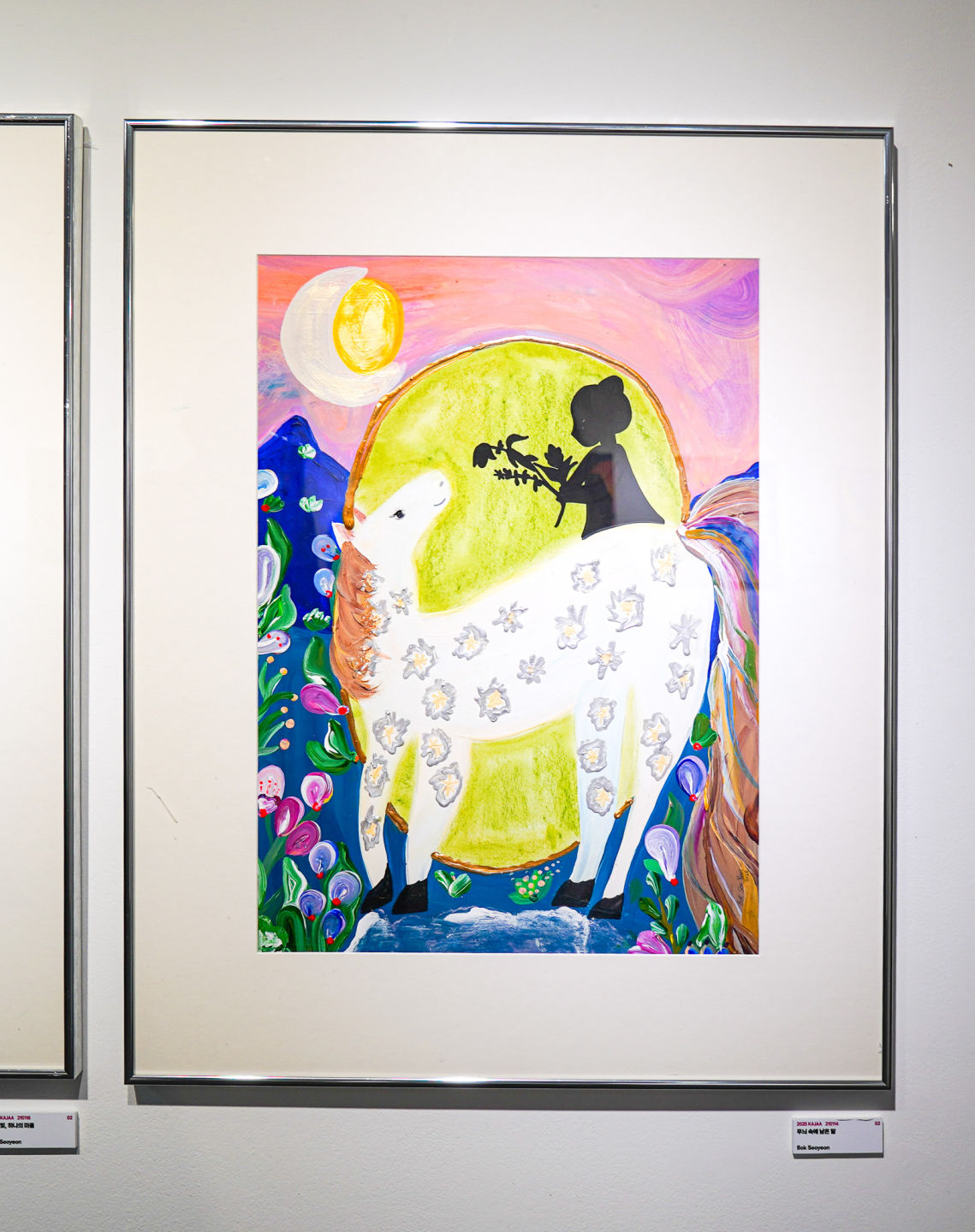 한 그루의 나무 위에 앉은 까치는 그 마음의 상징이에요. 한국에서는 복을 전하는 새이지만, 유럽에서는 불운이나 도둑의 상징으로 여겨지기도 해요. 하나의 존재가 서로 다른 의미를 가질 수 있다는 사실이 저에겐 다름의 아름다움처럼 느껴졌어요. 그 옆에 가득 열린 포도송이는, 작은 알갱이들이 모여 하나를 이루듯, 사람의 마음도 다양하게 모이면 풍요로워질 수 있다는 뜻을 담고 있어요. 그 사이엔 벚꽃이 피어 있어요. 짧고 화려하게 피었다 지는 벚꽃은 현대적 감성을 담고 있지만, 한국의 전통적인 자연과도 자연스럽게 어우러져요. 시대와 감성, 문화가 서로 다르더라도 함께 어울릴 수 있다는 걸 보여주고 싶었어요. 이 그림은 결국, 겉으로는 보이지 않아도 분명히 존재하는 마음들, 다름 속에서도 이어지는 조화와 연결을 이야기해요. 침묵 속에서도 마음은 흐르고, 그 마음은 색이 되고, 상징이 되고, 또 하나의 풍경이 되어 우리에게 다가와요. 이 모든 요소들이 모여, 보이지 않는 마음이 어떻게 조용히 전해질 수 있는지를 보여주고 싶었어요.