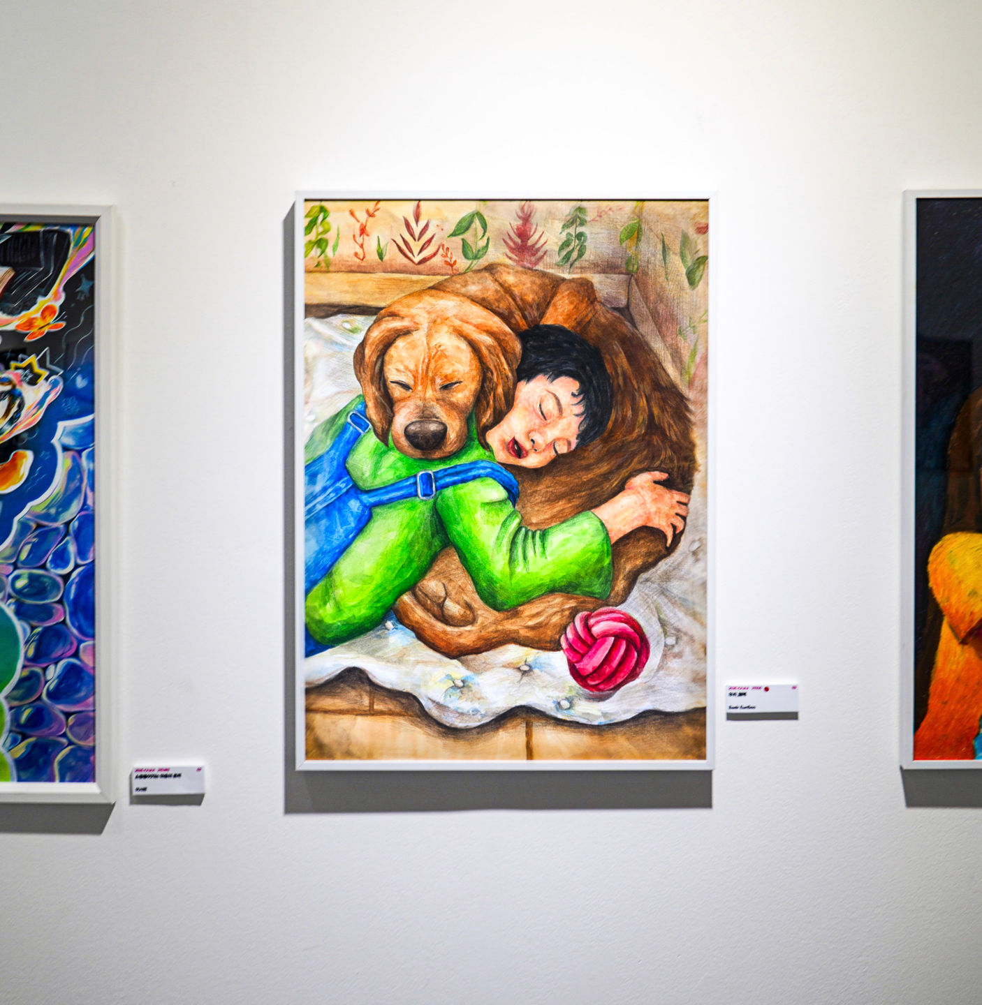 강아지와 어린아이가 함께 낮잠자고 있는 모습을 그렸습니다. 눈앞에 보지이 않더라도 아이와 강아지가 포근히 안고 낮잠을 자는 모습을 통해 서로 아끼고 소중히 여기는 마음을 전하고 싶었습니다. 대체적으로 따뜻한 분위기를 통해 서로 사랑을 느끼며 안정된 마음을 표현했습니다. 서로를 깊이 생각하는 마음은 눈에 보이지 않더라도 전할수 있다고 생각합니다.